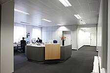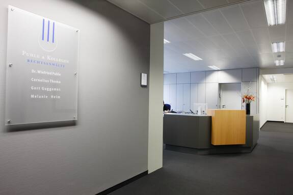 Das große Foyer der früheren Vorstandsetage einer Bank wird zum offenen Sekretariat mit Mandantenempfang um genutzt, ohne die Diskretion und den Datenschutz sensibler Daten zu vernachlässigen.