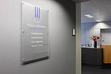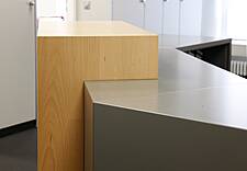 Mit dem Einbau der großen Theke gliederte sich der hallenartige Raum und bringt der erforderliche Trennung und Ruhe zwischen Sekretariat, Rechtsanwaltsbüro und Mandantenempfang.