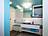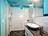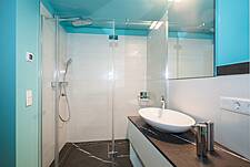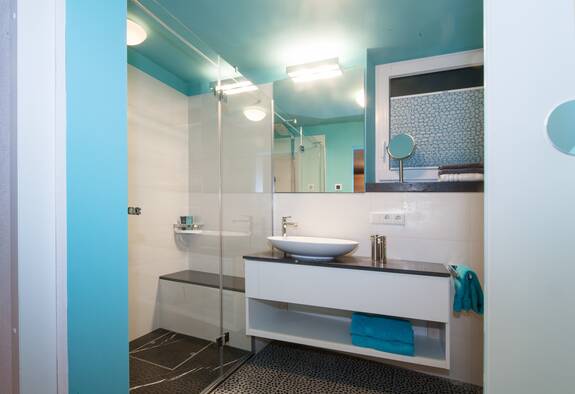 Mit Raffinesse und einem neuen Raumkonzept ließen sich die Wünsche der Bauherrin nach einer großen Dusche, viel Stauraum und vor allem einen ungehinderten Zugang in den Raum verwirklichen. Eine neue außenliegende Schiebtüre gewährt nun freien Eintritt in das Bad. Die raumbreite Dusche mit Sitzwürfel bietet großzügigen Duschspaß nach dem Saunagang. Eine für den Raum maßgeschneiderte Waschtischkonsole ermöglicht die ersehnte Ablagefläche mit viel Stauraum am Waschbecken. Mehr Tiefe im Raum entsteht durch den großflächigen Spiegel. Das frische Türkis für Wände und Decke erzeugt ein Gefühl wie klein Ozeanien.