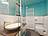 Eine in den Raum sich öffnende Türe trennte das Bad in zwei Bereiche und versperrte den freien Zugang zu Waschplatz und WC.
