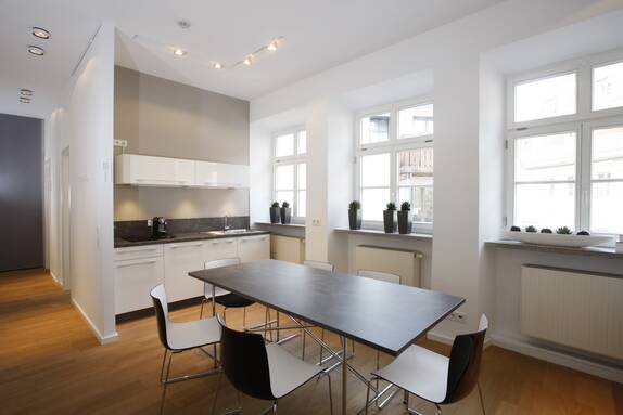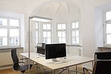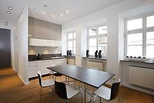 Ideen entwickeln und Ideen umsetzten ist in der Werbeagentur Buerofuenf GmbH Alltag. Inspirierende Arbeit gelingt am besten in einem dafür geschaffenem Umfeld. Die schlichte, moderne Einrichtung fügt sich harmonisch in den renovierten Altbau mit seinen charakteristischen Stilelementen ein. Das offene Raumkonzept bietet den Platz für Kommunikation im Team, mit Kunden oder Präsentationen von neuen Kampagnen. Das dezente Farbkonzept aus Holz, schwarz und weiß bleibt dabei dezent im Hintergrund für die Präsentation der neuen Werbekampagnen und deren Farbgestaltung.