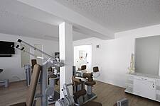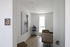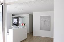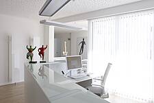 Das Raumkonzept auf 180m² umfasst einen großzügigen Trainingsbereich mit Geräten, Behandlungskabinen, Personalbereich, Gruppenraum und Nebenräumen. Die Bereiche gehen fließend ineinander über. Verglaste Lichtausschnitte in den Wänden erhellen die innenliegenden Flure. Das schlichte Farbkonzept in weiß mit Naturfarben wird durch ein modernes Beleuchtungskonzept unterstrichen.